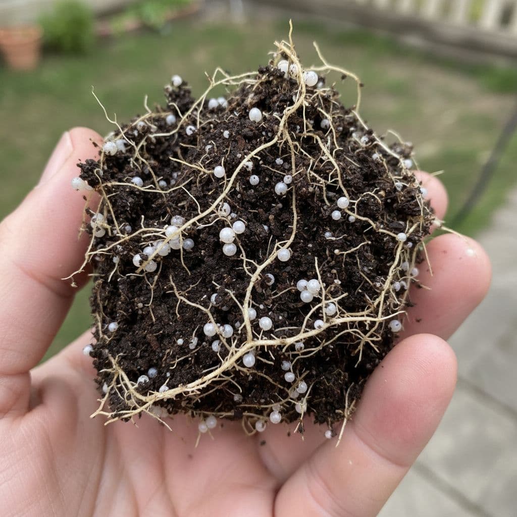 Start at the edge of a thinning patch, not the dead center. Use a hand trowel or small shovel and lift a few inches of turf with roots and soil attached. Then break the soil apart and inspect the root zone. Ground pearls look like tiny round beads, often white to pinkish or tan, attached near roots or sitting in the soil.