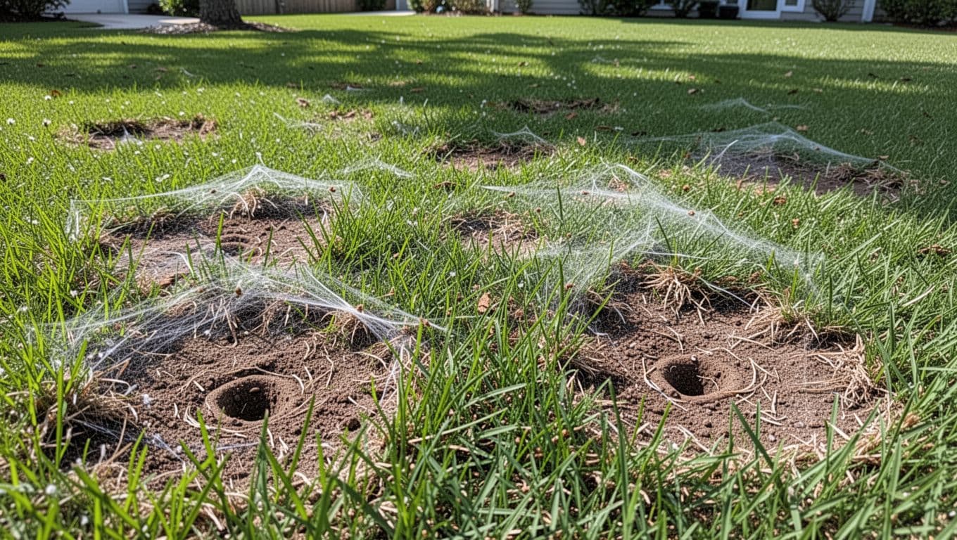 Frass, or worm poop, dots the soil. Fine silk webs and tiny tunnels appear in thinned areas. Bermuda shows quicker browning because it grows fast. Zoysia stays greener longer but thins unevenly.