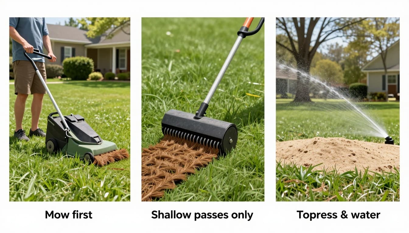 - Optional but helpful: core aerate after dethatching (or instead of a second aggressive pass), then topdress lightly with compost or sand where appropriate to help the surface break down thatch over time.
