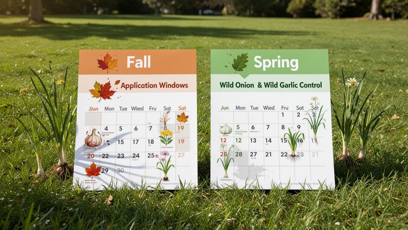 Wild onion and wild garlic lose to timed spots and thick turf. Start now in April. Repeat in fall. Bulbs fade over seasons.